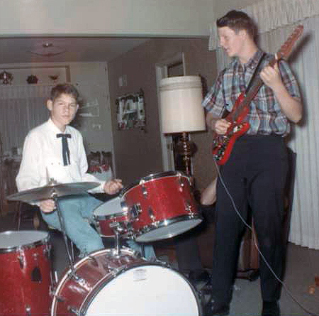 After piano, clarinet and accordian lessons, which I didn’t enjoy, I taught myself guitar. Mad Dog was inspired an dhe played along on coffee cans and pots. Finally we rented a snare drum and a cymbal so we could play properly. The first thing we learned was the intro to the song Love Potion #9 by the Searchers. We played that intro 50 times in a row, We were hooked! Of course the Beatles were just getting huge so we knew we could be just like them. So at Christmas, we asked for drums and a guitar.